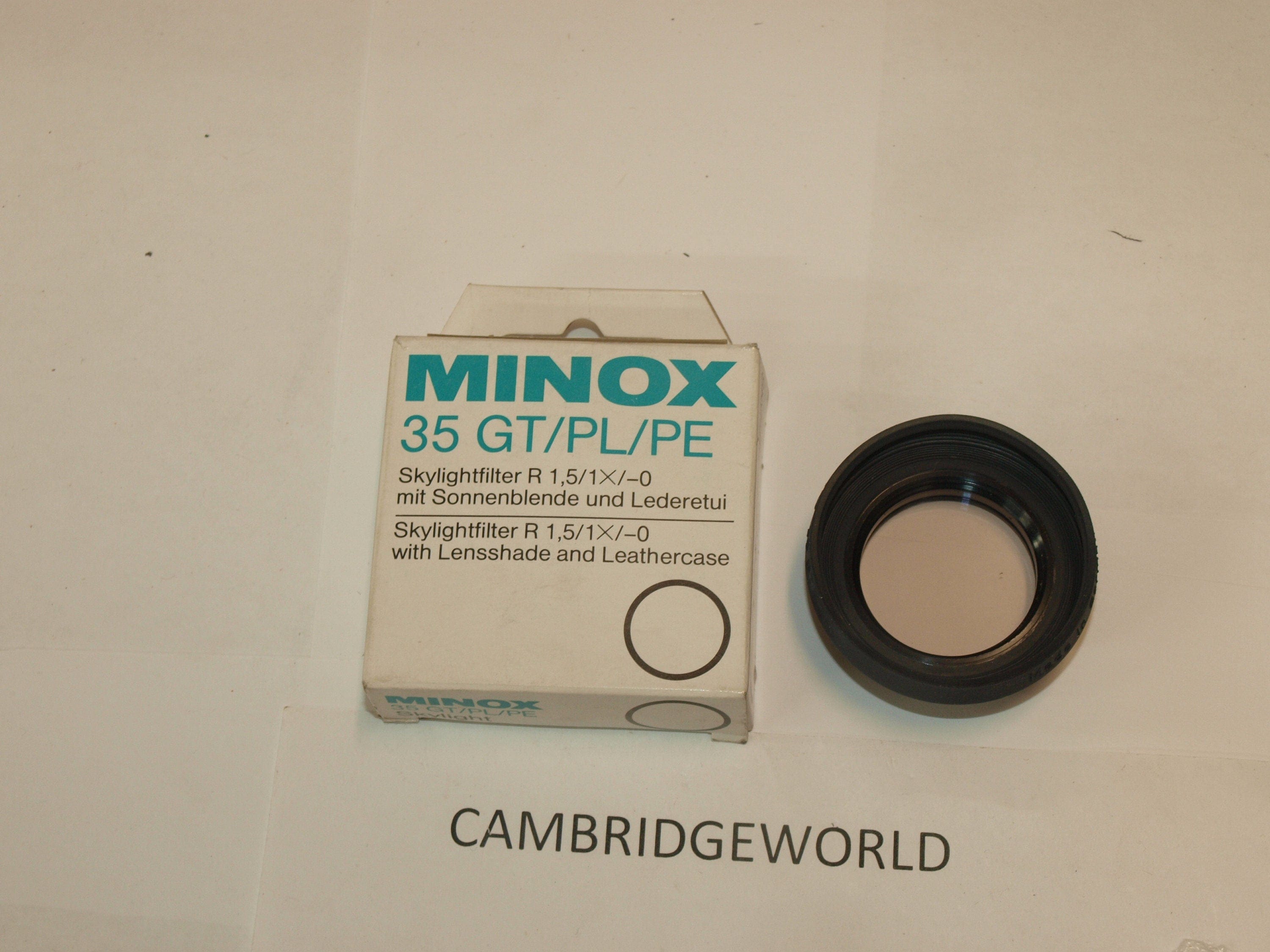 New old stock original Minox Skylight filter with lens hood and case for Minox GT PL PE cameras made in Germany
